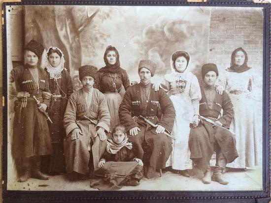 На фото из группы "Фотомузей КБР" на фейсбуке - Кабарда, Вольный Аул. Сидят справа Амшоков Индрис Патович, Амшоков Харун. Стоят девушки в белом Амшоковы Данаху и Назифа (сестра Индриса). Стоит Амшоков Шухиб Патович, в черном платке Амшокова Дан... Патовна. Сидит девочка Амшокова Лиза Патовна. Фото из архива семьи Озовых.