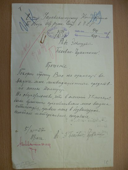 Прошение Эльмурзы Бековича-Черкасского о выдаче средств. Прага. 1927 г.