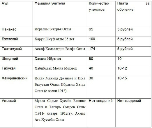 В школах преподавались Коран, арабский и черкесский языки. В настоящее время имеющийся в нашем распоряжении корпус источников не дает целостного представления о биографических данных учителей из Турции, целях их духовной миссии на Западном Кавказе, однако позволяет выявить аулы, в которых подобные школы были организованы, фамилии учителей, количество учеников и размер платы за обучение. На основании этих источников мной была составлена таблица.