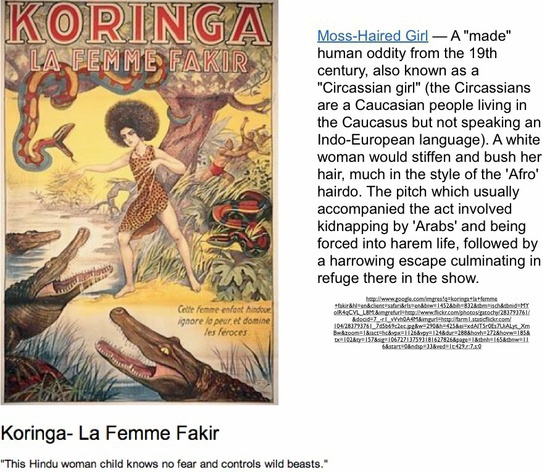 Происхождение их причесок неясно. Кинг предполагает, что это могло быть связано либо с "высокими, пушистыми шляпами», (папахи – НН) которые носили мужчины Кавказа, или от попытки "африканизировать" - и тем самым еще сексуализировать - эту квинтэссенцию кавказских людей. Что совершенно ясно, что западные маркетологи черкесской темы часто понятия не имели, что они продавали, как это видно на французском плакате "Koringa".