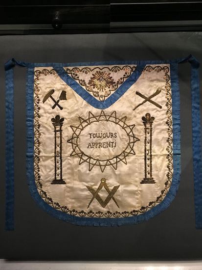 Фартук Мастера с изображениями основных символов масонства. Циркуль обозначает небесный свод, а угольник - землю.