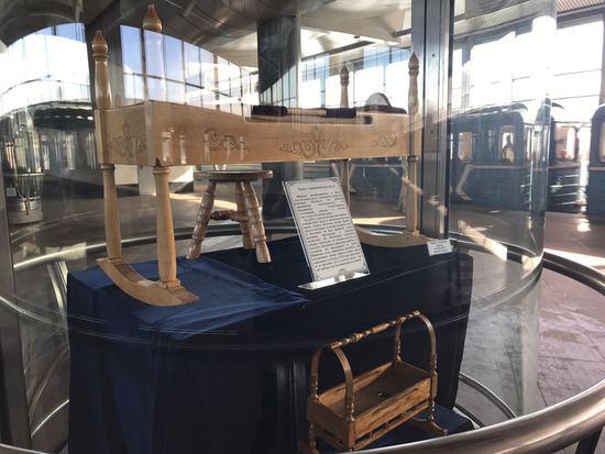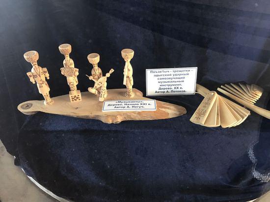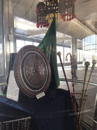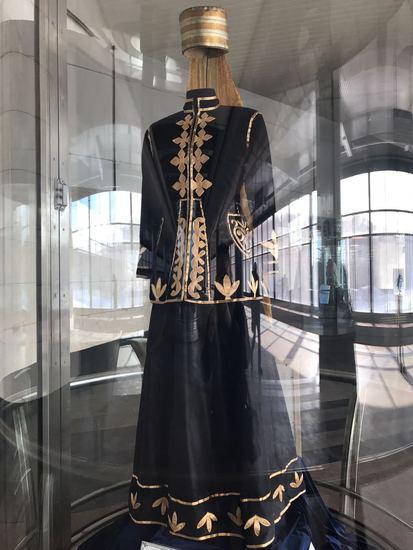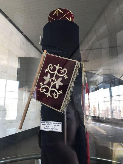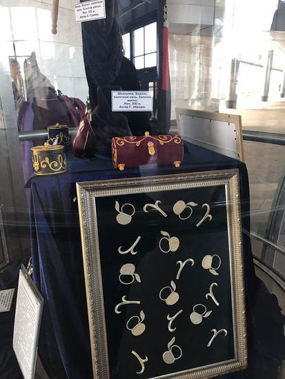 Что представлено на выставке? Это работы современных мастеров. В огромных стильных круглых стеклянных витринах – колбах выставлены и черкески, и женские платья с ручной вышивкой, и знаменитые черкесские столики анэ, и детские люльки, и свадебные знамена из орехов и многое другое.