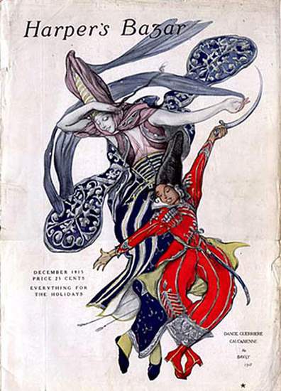 Это – декабрьская обложка американского журнала Harper’s Bazar, вышедшего в 1915г. Я узнала о ней благодаря дизайнеру Мадине Саральп, а затем журналисту Фатиме Тлисовой, которые разместили ее на своих страницах в фейсбуке. На обложке авторства блистательного театрального художника Леона Бакста танцующая пара и надпись на французском – Dance Guerriere Caucasienne («кавказский воинский танец»).