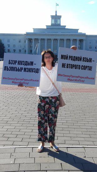 На фото - Лидия Жигунова. Одиночный пикет в защиту родного языка. Нальчик. 20 июля 2018г.