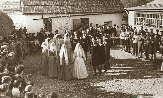 Тачанки и автомобили. Раньше невесту забирали из отцовского дома на тачанке. Ее сопровождали всадники, которые ехали впереди и позади тачанки. Они пели специальную для таких случаев песню «Оридадэ»: начинал один, а остальные подхватывали и пели хором. Одна группа пела один куплет, а вторая – следующий. В каждой группе всадников были свои певцы. В 1960-е гг. впервые невесту привозят в дом жениха на машине. Это считалось престижным. и было показателем особого шика. Для таких целей машину брали в колхозе. Невеста и жених впервые сидят в машине вместе, что долгое время осуждалось и воспринималось как новшество.