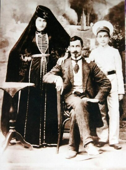 На этом фото из книги М. Иваноковой «Адыгские (черкесские) золотошвеи из Причерноморской Шапсугии» слева в национальном костюме, вышитом собственными руками, Вахида Османовна Хлечас-Цикунибова с отцом и братом из аула Агуй-Шапсуг (Карповка). Ей всего 13 лет.