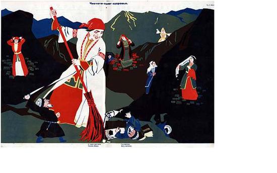 Плакат с двусмысленным названием «Чистота – залог здоровья» (1923), на котором изображена мужеподобная горянка-великанша  в красной косынке и с открытым лицом, призывал горянок выметать традиции, словно мусор. С сайта www.polit.ru