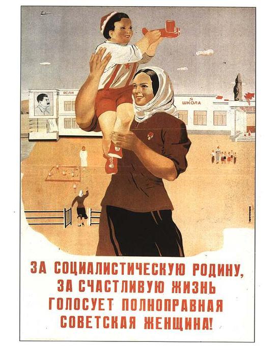 В плакатах появляется некий обобщенный образ освобожденной женщины Востока, которая уже теряет всякую этническую принадлежность и называется просто «советская женщина». Образ с одной стороны, безличен, что усиливается бежево-коричневой гаммой плаката. С другой – в нем совмещаются детали, которые можно одинаково отнести к центральноазиатской и кавказской культурам (платок, покрывающий голову) или только к центральноазиатской (мальчик на плече женщины - в характерной азиатской тюбетейке).