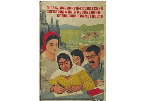 1930-е гг. – это время борьбы с неграмотностью, перевода кавказских письменностей с латиницы на кириллицу. Однако как ни странно, плакатов на эту тему, ориентированных специально на Кавказ, практически нет. Очень редкий экземпляр посвящен Азербайджану. На плакате "закрепощенных женщин Востока" учит писать, видимо, уже "раскрепощенная женщина Востока", голова которой повязана красным платком в характерной для 1930-х гг. манере.