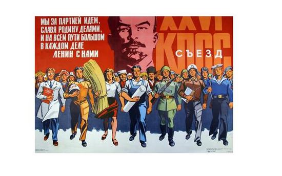 Правда, кавказцы, выполняя решения съездов, все-таки появляются на плакатах, как, например, на этом. Интересно, что фигуры тех, кто идет вслед за партией, располагаются в два ряда. Впереди, в первом ряду с левой стороны, - те, кто кормил народ (знатная колхозница), те, кто его лечил (врач), те, кто достойно представлял его в космосе (космонавт), и инженер - видимо, как символ всех людей умственного труда. А справа - те, кто защищал страну - солдат, милиционер и матрос.