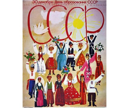На плакате Кундышева про День образования СССР - одно из редких изображений кавказских горцев в плакатной живописи 1980-хгг. На плакате 15 фигурок в национальных костюмах, символизирующих соответствующие республики СССР. Горец и две девушки в кавказском костюме - судя по всему, символизирует Грузию, Армению и Азербайджан. А заодно и вообще являются собирательными образами всех кавказских народов. Сегодня, из 2010 года, зная, что система под названием СССР рухнула в одночасье через 6 лет после публикации этого плаката, он вызывает грусть и совсем не те ассоциации, ради которых был написан. Фигурки смотрятся как куклы и муляжи, а надпись СССР кажется хрупкой конструкцией, которую не состоянии спасти никакие усилия тех, кто держит ее в руках. А руки, вскинутые вверх с букетами цветов, выглядят как прощальный жест... Как будто это плакат-расставание с СССР.