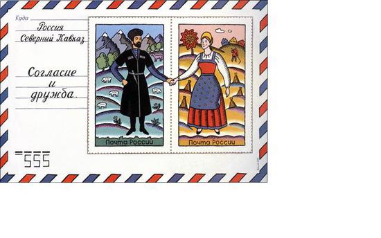 Совершенно случайно обнаружила этот милый плакат, написанный художницей Зверевой в 2000 году. Он выполнен как имитация почтовой открытки с двумя марками. Одна марка - это кавказский горец на фоне гор и пасущихся овечек; он, естественно, символизирует Северный Кавказ. Другая марка - молодая девушка в традиционном русском костюме на фоне поля и собраннных снопов сена. Это символ России. Рисунки сделаны в такой стилистике, что отсылают нас к детским книжкам и детским воспоминаниям о царевнах -несмеянах и дедушке Морозко. "Нужно только выйти за рамки своих стереотипов и границ и пойти навстречу друг другу и тогда воцарится мир и согласие", - это совсем простые истины, которые хотел донести художник..