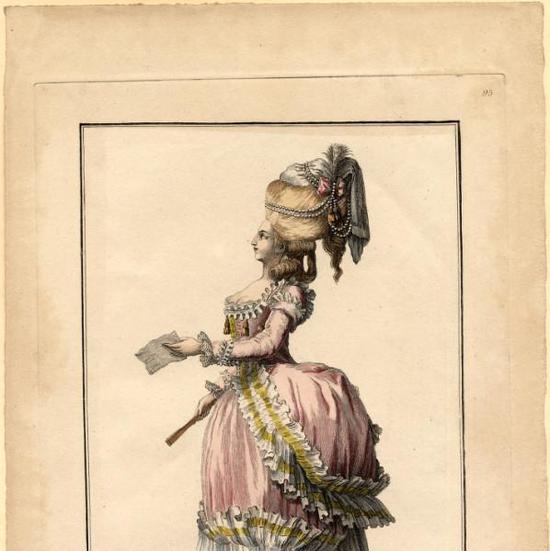 Рисунок 1750 года. Женщина одета в розовое платье в стиле Circassienne (стиль назван по имени региона на Кавказе). Платье с глубоким декольте, утопающим в белых оборках, и белые оборки также на плечах, запястьях и манжетах. Более темно-розовые кисти свисают с шеи, и вертикальные желтые ленты украшают лиф. Широкая, желто-белая полосатая оборка украшает юбку сзади. Обувь женщины желтая, с розовыми бомбонами. Ее волосы или парик устроены в тщательно продуманном стиле, украшены нитками жемчуга, розовым бомбоном и кисточками, белым пером, и белой накидкой. Она держит закрытый веер в правой руке и лист бумаги – в левой.
