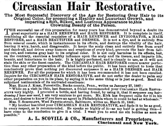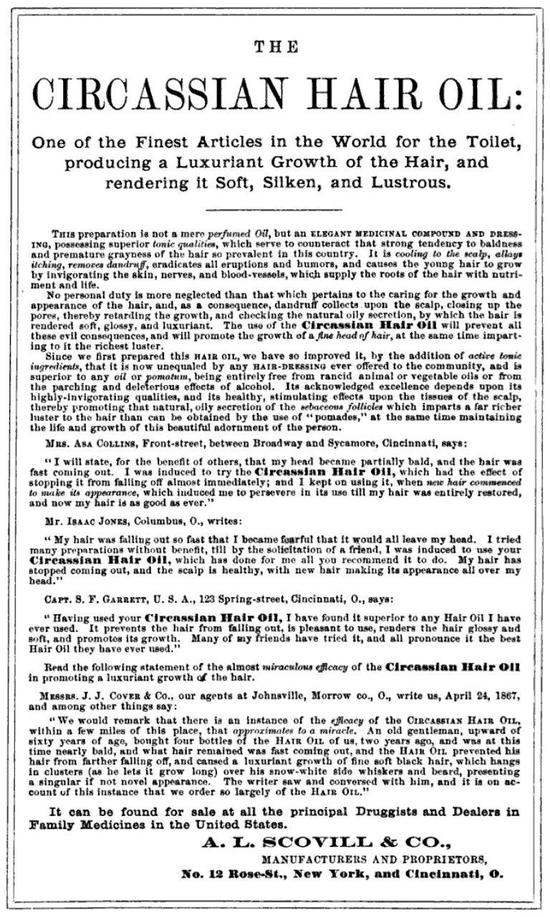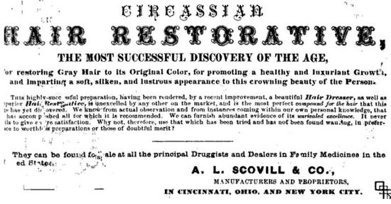 В 1875 году John F. Henry, Curran & Co., опубликовал в своем каталоге рекламные объявления для продуктов Scoville's, включая Circassian Hair Oil and Circassian Hair Restorative. Вероятно, сами продукты поступили на рынок в 1853 году. На сайте http://www.hairraisingstories.com есть информация о том, что рецепт приготовления этих препаратов был куплен A.L. Scoville у других аптекарей, John Hocker Jr. и его братa, которые работали в Филадельфии в 1850х.