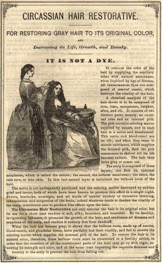 Ad from 1861 for Circassian Hair Oil, Ad from 1867 Ladies Repository, 1867 Ad from Scoville Almanac, Ad from 1875 John F. Henry Catalog
