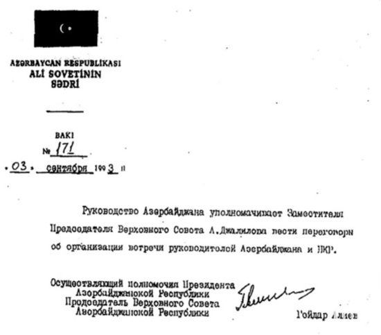 "Азербайджанское руководство гарантирует главе Верховного Совета А. Джалилову провести переговоры о встрече руководителей Азербайджана и НКР". То есть, в Азербайджане еще с 1993 года признали существование Нагорно-Карабахской Республики (сегодня Республика Арцах) как де-факто, так и де-юре.