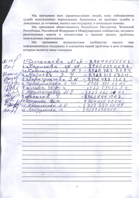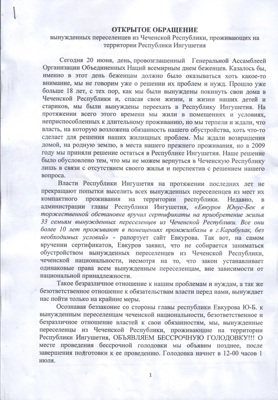 Осознавая беззаконие со стороны главы республики Евкурова Ю-Б. к вынужденным переселенцам чеченской национальности, безответственное и безразличное отношение властей к свои обязанностям, мы, вынужденные переселенцы из Чеченской Республики, проживающие на территории Республики Ингушетия, ОБЪЯВЛЯЕМ БЕССРОЧНУЮ ГОЛОДОВКУ!!! О месте проведения бессрочной голодовки мы объявим позднее, после завершения подготовки к ее проведению. Голодовка начнет в 12-00 часов 1 июля.