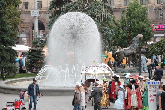 В Киеве много туристов, естественно это стало причиной развития уличных театрализованных представлений, жонглеров, танцующей молодежи, наличия «ряженных» в старинные костюмы, может быть 17-19 веков. Например, вот как эти девушки