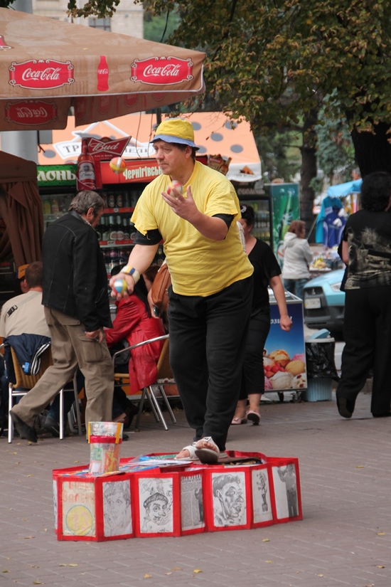 А этот артист стоит не двигаясь, как-будто "замерз", до тех пор, пока благодарная публика не замотивирует его материально, но как только денежка упадет в его коробку, так он и начинает жонглировать.