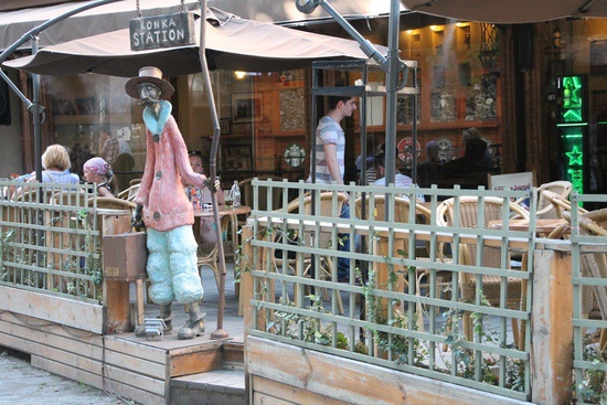 Париж напоминает буквально все, вымощенные камнем узкие улочки, старинные постройки, зонты уличных кафешек, элементы декора.
