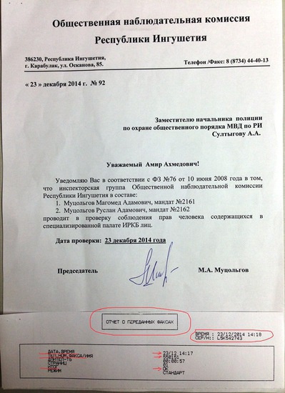 Уведомление о планируемом посещении специализированной палаты ИРКБ от 23.12.2014 года, за исх. №92 было направлено посредством факсимильной связи на один из номеров МВД по РИ (55-01-51) в 14 часов 17 минут 23.12.2014 года, о чем свидетельствует отчет о переданных факсах, имеющийся в распоряжении Общественной наблюдательной комиссии Республики Ингушетия. Два других номера 55-01-32 и 55-00-49, не отвечали с утра и до 14 часов 15 минут, так же, на этих номерах был отключен автоматически включающийся факс. Кроме того, председателем комиссии Муцольговым М.А. было дополнительно сообщено посредством телефонной связи заместителю начальника полиции по охране общественного порядка МВД по РИ А.А. Султыгову о прибытии инспекторской группы с целью проведения проверки в специализированной палате ИРКБ, что так же является уведомлением о планируемой проверке. Султыгов ответил что факса он не получал, на что ему был указан, номер факса, по которому сотрудник МВД по РИ подтвердил получение уведомления.