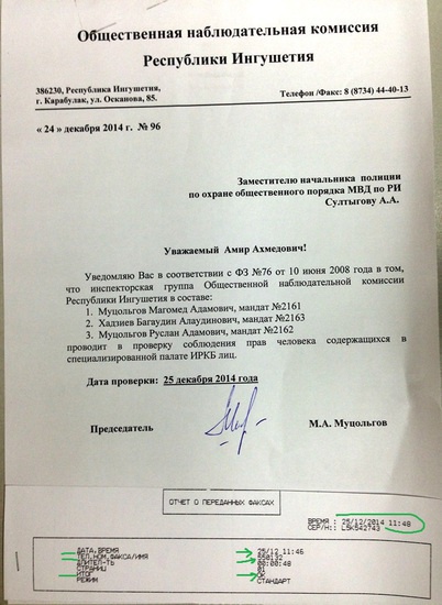 Уведомление о планируемом посещении специализированной палаты МВД по РИ в ИРКБ от 24.12.2014 года, за исх. №96 было направлено посредством факсимильной связи на представленный для связи с МВД по РИ номер телефона (55-01-32) в 11 часов 46 минут 25.12.2014 года, о чем свидетельствует отчет о переданных факсах, имеющийся в распоряжении Общественной наблюдательной комиссии Республики Ингушетия. Кроме того, членом комиссии Муцольговым Р.А. было дополнительно сообщено посредством телефонной связи заместителю начальника полиции по охране общественного порядка МВД по РИ А.А. Султыгову о направлении посредством факсимильной связи уведомления и планируемом посещении специализированной палаты МВД по РИ в ИРКБ.