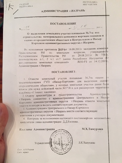 В 2011 году постановлением за №400, городские власти, вняв наконец-то к мольбам и просьбам жителей Насыр-Корта, отвели земли, для выделения нуждающимся в земельном участке для жилищного строительства. Отведенный для сельчан земельный массив располагается на окраине г. Назрань, за Алханчуртским каналом в районе 105 жилого массива, около Государственного унитарного предприятия «Насыр-Кортское». Со слов жителей Насыр-Кортского м/о, немногим позже, они все чаще стали слышать от посторонних людей о приобретении последними земельных участков именно в отведенном им в 2011 году земельном массиве, но при этом, самих сельчан к земельным участкам не допускали. Спустя 3 года, уже в 2014-м, постановление об отводе земельного массива было отменено, но, со слов сельчан, которые представились Магомед-Баширом, Муссой, Али и Яхьей, есть люди, жители других населенных пунктов, которым приходят квитанции к оплате земельного налога за владение земельными участками в том самом массиве, о существовании которых они даже не знали. В числе несостоявшихся обладателей земельных участков, жители Насыр-Корта, представители множества фамилий, среди которых Евлоевы, Алмазовы, Аушевы, Газгиреевы, Джандиговы, Ханиевы, Бабакиевы, Эсмурзиевы и другие.