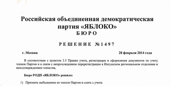 Кстати, хочу привести еще одну политико-историческую справку. Решением Бюро Политической партии «Российская объединенная демократическая партия «ЯБЛОКО», от 28.02.2014 года за №1497 Евлоев Зелимхан Султанхамидович был исключен из рядов партии, причиной чего, послужила утрата с ним связи. А до дня исключения, на протяжении долгих лет, он числился руководителем Первичного отделения Ингушского регионального отделения ПП РОДП «ЯБЛОКО» в г. Карабулак. Согласно норм действующего законодательства и уставов всех партий, членство одновременно в двух партиях, запрещено. Поэтому мне не понятно, каким образом Евлоев возглавил региональное отделение партии «Единая Россия» являясь членом партии «Яблоко».