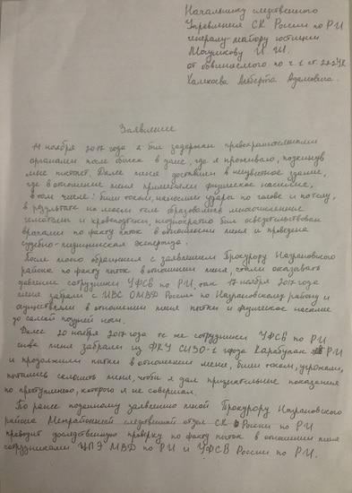 1 декабря 2017 года, ко мне в ФКУ СИЗО-1 г. Карабулак, где я содержусь под мерой пресечения в виде заключения под стражей, приходил некий Михайлов М.А. и угрожал мне, моим родным и близким. Говоря мне, что если я не напишу заявление о том, что не имею претензий к сотрудникам правоохранительных органов, иначе пострадают мои родные и близкие, а также они сделают так, чтобы было хуже и мне.