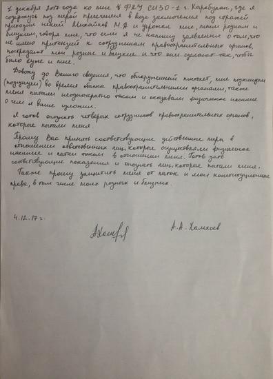Прошу Вас принять соответствующие действенные меры в отношении ответственных лиц, которые осуществляли физическое насилие и пытки током в отношении меня. Готов дать соответствующие показания и опознать лиц, которые пытали меня.
