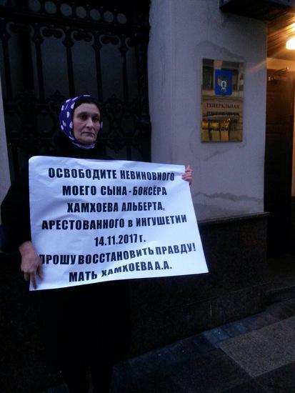 В Москве у органов государственной власти, прошли одиночные пикеты, с требованием освободить задержанного в Ингушетии молодого человека. Аза Хамхоева, мать задержанного в Ингушетии 14 ноября Альберта Хамхоева просит восстановить права ее сына.