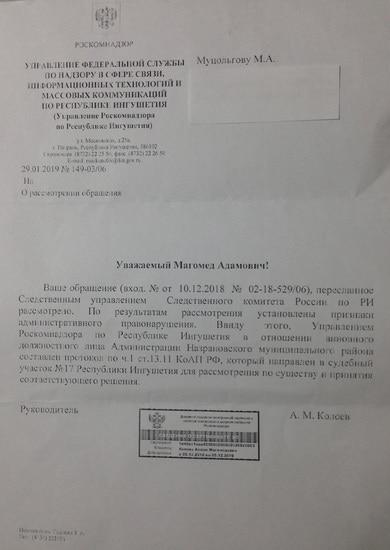 Вчера в мой адрес поступило письмо из Роскомнадзора, в котором сообщается, что в части незаконной обработки персональных данных, указанных в моем обращении, в отношении виновного должностного лица Администрации Назрановского муниципального района составлен протокол о совершении административного правонарушения, который направлен Мировому судье для рассмотрения по существу. Роскомнадзор признал мои доводы обоснованными и в пределах своих полномочий, принял меры. Меня искренне радует, что наши чиновники и правоохранительные структуры, стали прислушиваться к обоснованным претензиям граждан о нарушении их прав. Надеюсь, что эти первые шаги в сторону справедливости, будут продолжены и в будущем.