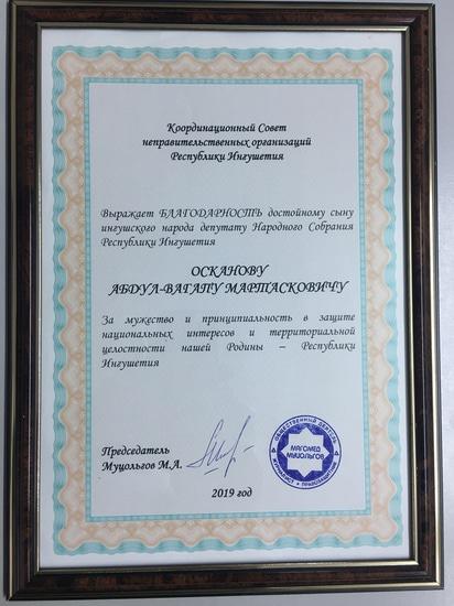 Сегодня, 5 февраля, представители общественности посетили дом депутата Народного Собрания Республики Ингушетия Абдул-Вагапа Осканова, умершего после продолжительной болезни в конце прошлого года. Представители Координационного совета неправительственных организаций Республики Ингушетия, вместе с депутатами Народного Собрания республики и представителями Ингушского комитета национального единства, от лица общественности вручили вдове Абдул-Вагапа Осканова благодарственное письмо. Решение об этом, было принято на последней встрече общественников.