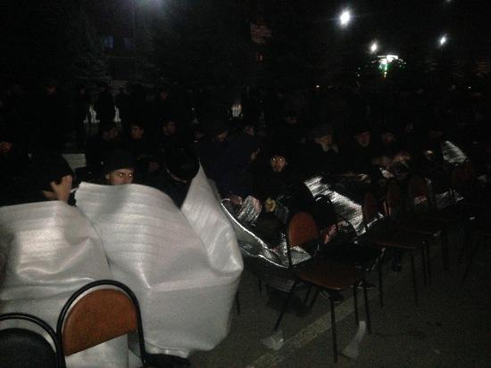 Пока религиозные деятели, собравшись в круг совершают обряд Зикр, оставшаяся часть митингующих укутавшись в пледы и подложку, пытаются не замерзнуть. На улице около «0» градусов.