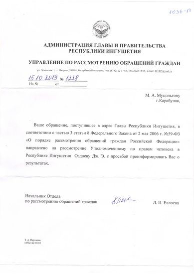Несколько дней назад в мой адрес поступил ответ из администрации главы. По Федеральному закону №59 «О ПОРЯДКЕ РАССМОТРЕНИЯ ОБРАЩЕНИЙ ГРАЖДАН РОССИЙСКОЙ ФЕДЕРАЦИИ», это обращение должно было быть рассмотрено главой, но вопреки этому закону, он переправил мое обращение в адрес Уполномоченного по правам человека в Республике Ингушетия Джамбулата Оздоева, для рассмотрения и поручением дать мне ответ. Как бывший прокурор, опытный юрист, глава не мог не знать и не понимать необоснованность перенаправления моего обращения для рассмотрения Джамбулату Оздоеву, ведь в нем не содержится никаких вопросов, находящихся в его компетенции. Моя просьба была ориентирована исключительно к Калиматову и не понимать этого он не мог.