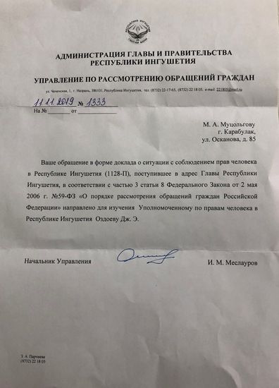 В конце октября мой доклад был направлен в адрес главы Ингушетии. Сегодня пришел ответ, точнее формальная отписка за подписью начальника Управления по рассмотрению обращений граждан Администрации главы республики. В этом письме сообщается, что Доклад о нарушении прав человека в Республике Ингушетия направлен в адрес Уполномоченного по правам человека в Республике Ингушетия, при этом там же содержится ссылка на ч.3 ст.8 Федерального закона «О порядке рассмотрения обращений граждан Российской Федерации».