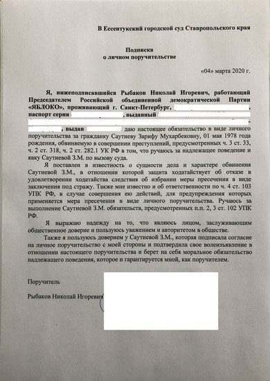 Адвокат Зарифы Билан Дзугаев, представил суду 16 поручительств за свою подзащитную. В качестве поручителей за Зарифу Саутивеу выступили Председатель партии «ЯБЛОКО» Николай Рыбаков, председатель Ингушского регионального отделения «ЯБЛОКО», мой брат Руслан Муцольгов, а так же 13 депутатов Народного собрания Республики Ингушетия и я. Учитывая все обстоятельства, учитывая такое огромное количество поручительств, личность самой Зарифы, надуманность обвинения и отсутствие каких-либо оснований для продления срока ее ареста, судья просто был обязан как минимум избрать ей другую меру пресечения, не связанную с лишением свободы. Был, но не сделал этого.