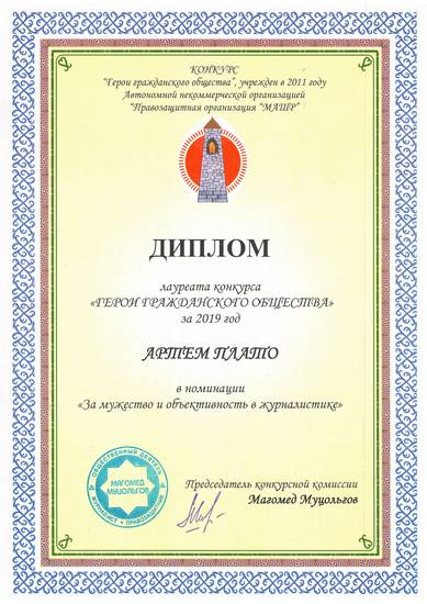 Имена лауреатов Конкурса «Герои гражданского общества» были опубликованы в январе этого года, но вручить диплом Артему получилось только сейчас 30 июня, когда он вновь приехал в Ингушетию.