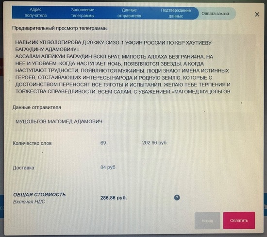 Сегодня я прочитал, на сайте 6portal.ru, напоминание о том, что наши узники совести и политзаключенные всегда ждут наших писем, тем более в день своего рождения. 19 июля день рождения Багаудина Хаутиева и мне захотелось отправить ему телеграмму. Каково было мое удивление, когда я узнал, что это можно сделать не выходя из дома, просто с использованием интернета. Честное слово, очень удобно. Естественно я воспользовался этой услугой и отправил Багаудину телеграмму следующего содержания: «Ассалам алейкум Багаудин! Брат, Милость Аллаха безгранична, на нее и уповаем. Когда наступает ночь, появляются звёзды. А когда наступают трудности, появляются мужчины. Люди знают имена истинных героев, отстаивающих интересы народа и родную землю, которые с достоинством переносят все тяготы и испытания. Желаю тебе терпения и торжества справедливости. Всем Салам. С уважением Магомед Муцольгов.»