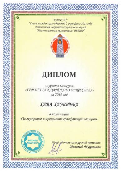 Всех заслуг Хавы просто не опишешь, да и сейчас в этом нет необходимости, но вот спустя годы, в этом я уверен, обязательно найдется тот, кто возьмет на себя ответственность увековечить имена наших современников, кто внес свой вклад в защиту прав и интересов нашего народа и республики и в их числе в первых рядах, должно будет стоять имя Хавы Хазбиевой. Принимая свое решение, Конкурсная комиссия ежегодного Конкурса «Герои гражданского общества», не сомневаясь ни на минуту, единогласно признала Хаву лауреатом в номинации «За мужество и проявление гражданской позиции».