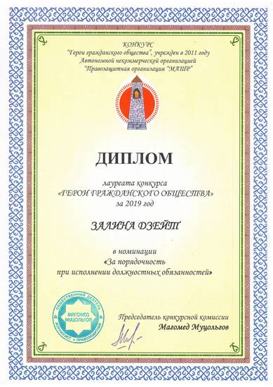 Сегодня я расскажу о Залине Дзейт, она, как и Николай Рыбаков, награждена в номинации «За порядочность при исполнении должностных обязанностей».