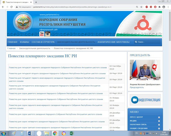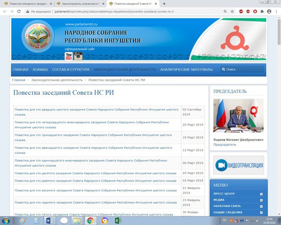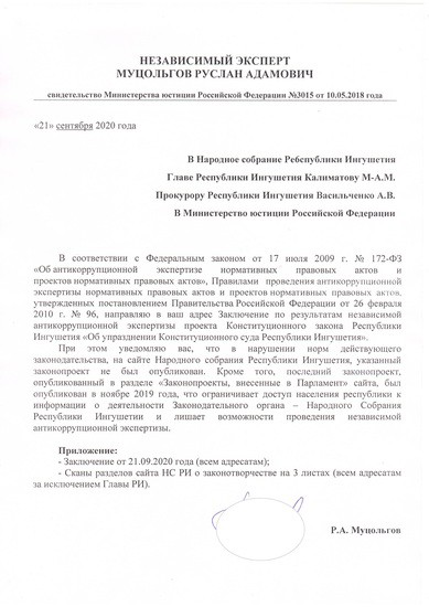 Кстати, направляя заключение он указал и на тот факт, что в нарушении норм действующего законодательства, на сайте Народного собрания Республики Ингушетия, указанный законопроект не был опубликован. Кроме того, последний законопроект, опубликованный в разделе «Законопроекты, внесенные в Парламент» сайта, был опубликован в ноябре 2019 года, что ограничивает доступ населения республики к информации о деятельности Законодательного органа – Народного Собрания Республики Ингушетии.
