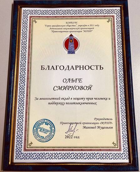 Именно в этот день, Правозащитная организация «МАШР» хотела бы выразить свою поддержку и объявить благодарность одной из самых ярких российских активисток из Санкт-Петербурга Ольге Смирновой, за многолетний вклад в защиту прав человека и поддержку политзаключенных. Сейчас она сама стала жертвой несправедливости и находится в СИЗО. Но еще раньше, начиная с апреля 2019 года, она неоднократно выступала в защиту политзаключенных, фигурантов «Ингушского дела». Я желаю Ольге здоровья, любви и счастья, а так же скорейшего освобождения и возвращения к родным и близким.