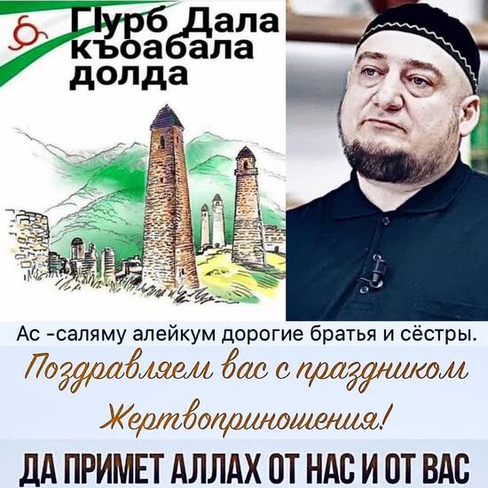 Сегодня, от всей души я поздравляю всех мусульман с праздником. Желаю нам всем единства и сплочённости нашей УМЫ, крепкого кавказского здоровья, большого личного счастья, добра, мира, благополучия и процветания, всего самого наилучшего нам всем в этом мире, милости Аллаха и райских садов. Всем, кто сегодня лишен свободы, а так же их родным и близким, я желаю сил и терпения. На все воля Аллаха!