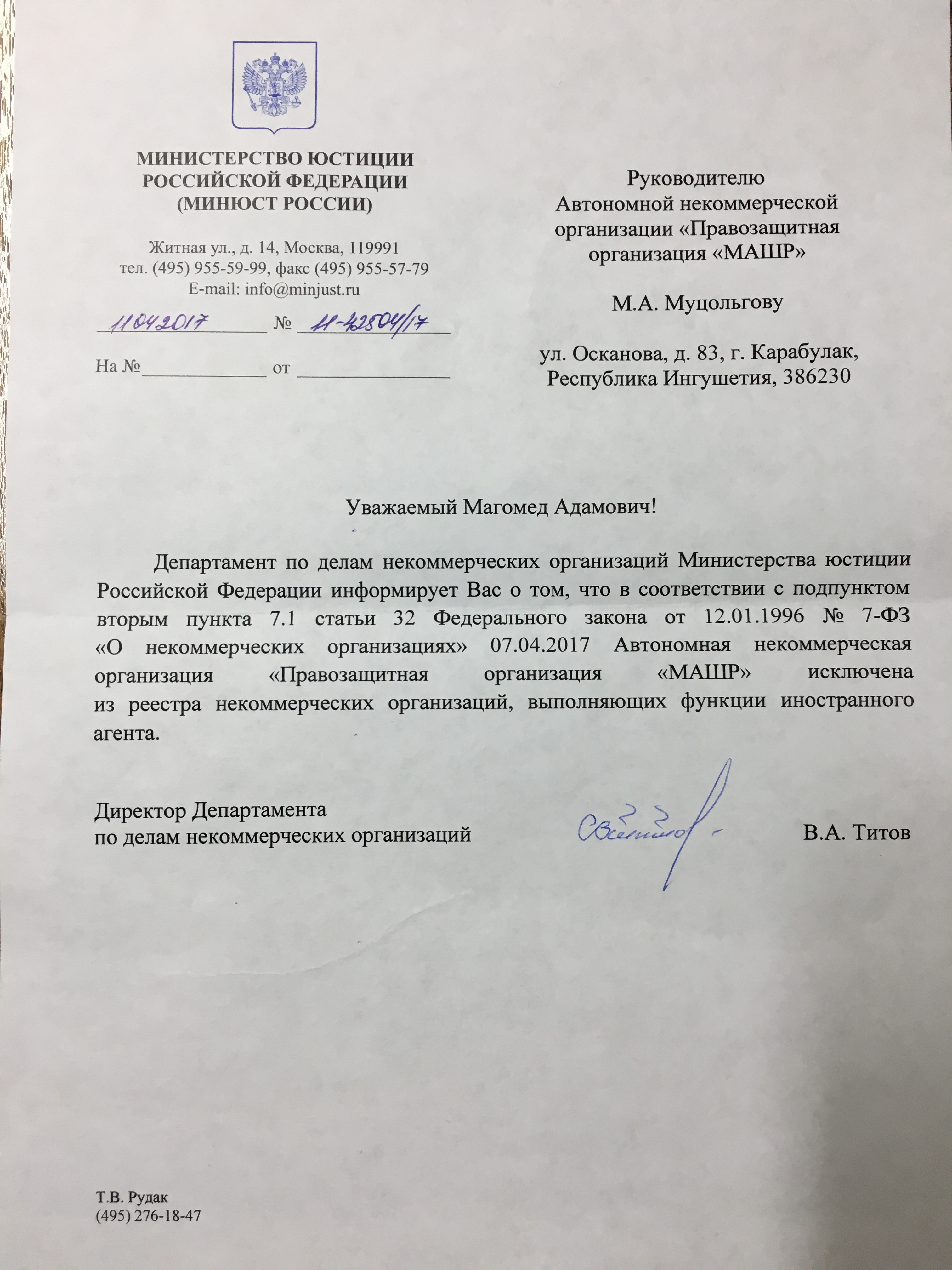 Ну вот сегодня, в организацию поступило официальное письмо Директора Департамента по делам некоммерческих организаций Титова В.А., который сообщает нам, что 7.04.2017 года, Правозащитная организация «МАШР» исключена из реестра некоммерческих организаций, выполняющих функции иностранного агента.