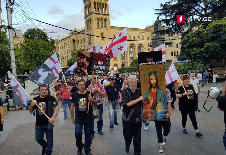 Протестующие собрались у станции метро Руставели и в данный момент направляются к офису «Фонда открытое общество» (Фонд Сороса).