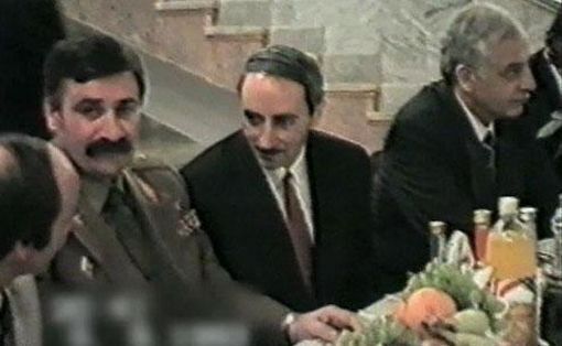 Джохар Дудаев и Руслан Аушев на банкете в Грозном. Справа от Дудаева — Звиад Гамсахурдия, нашедший после своего изгнания из Грузии приют в доме Дудаева. Иллюстрация: скриншот YouTube