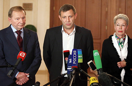 5 сентября 2014. Фото: ИТАР-ТАСС Экс-президент Украины Кучма и одна из многочисленных жертв многоходовочек и хитропланов, написанных на коленке, глава ДНР Захарченко.