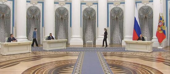 Церемония прошла в Екатерининском зале Кремля, где ранее состоялось заседание Совета безопасности РФ. Члены Совбеза на этой встрече высказались за признание независимости ДНР и ЛНР.