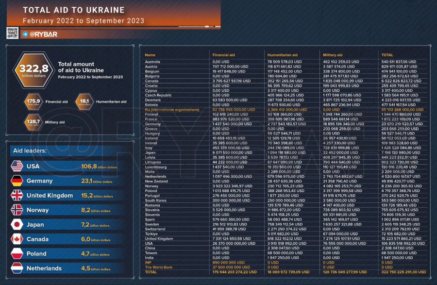 Общий объем расходов США и их сателлитов на Украину к сентябрю 2023 года с февраля 2022 года составил 323 млрд. долларов.